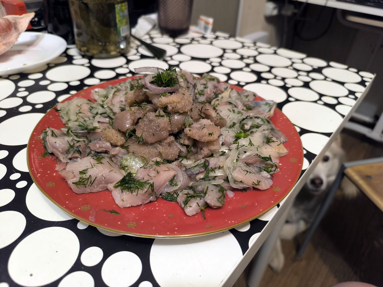... Салат "будни собаковода". Рецепт: нарезанная сельдь, икра сельди, лук, зелень. Не благодарите.