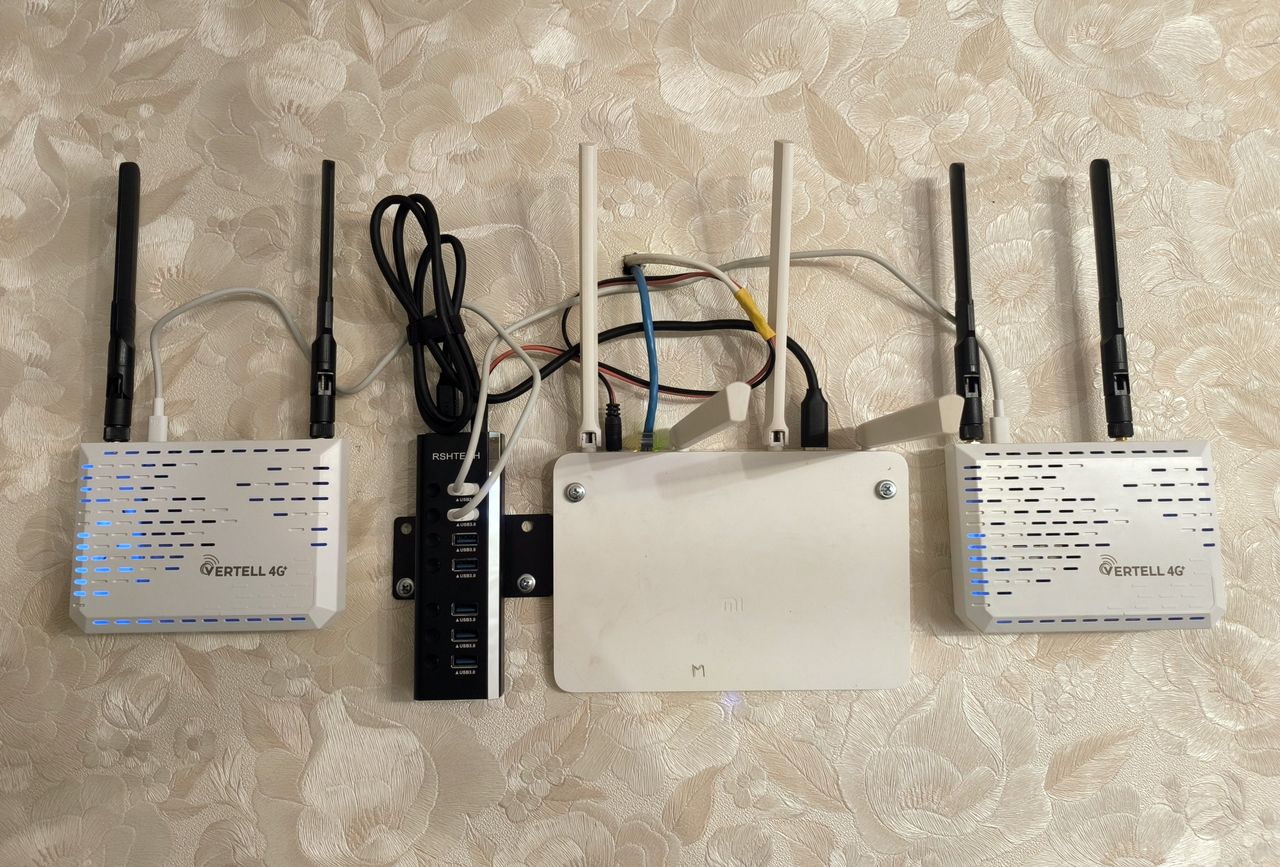 Это два модема Quectel EC25, которые через USB-хаб подключены к роутеру Mi Router 3G Rev. 1, на котором в свою очередь крутится Asterisk. Который помимо прочего умеет принимать голосовой вызов через один модем и транслировать его в другой.